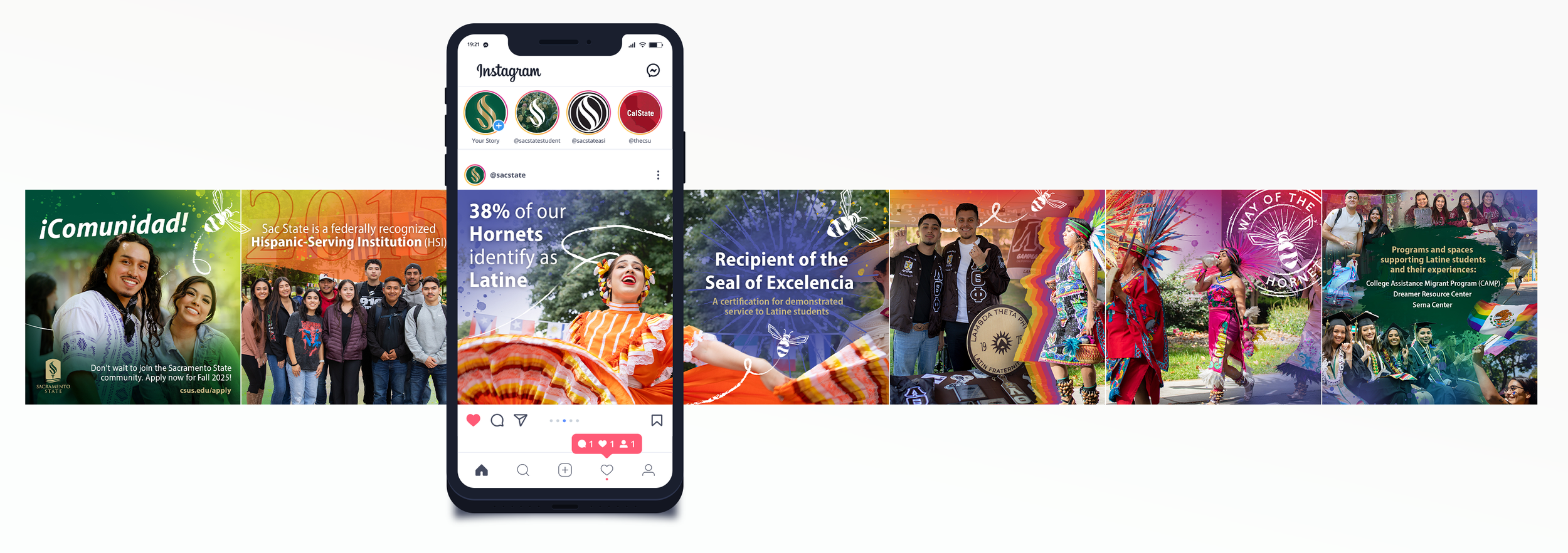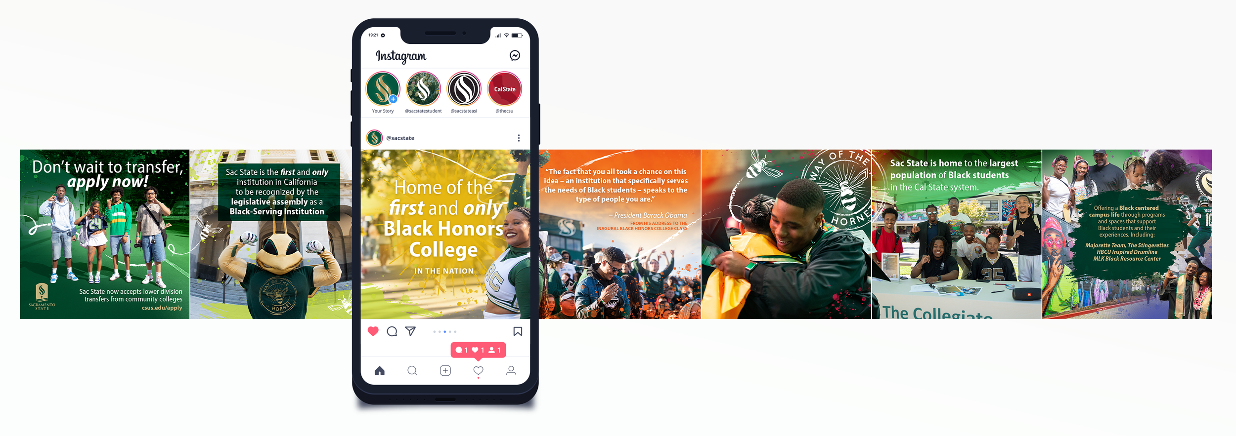 Instagram carousels celebrating key student communities, such as Black, AANAPISI, and Latinx students, reinforce Sacramento State’s inclusivity.