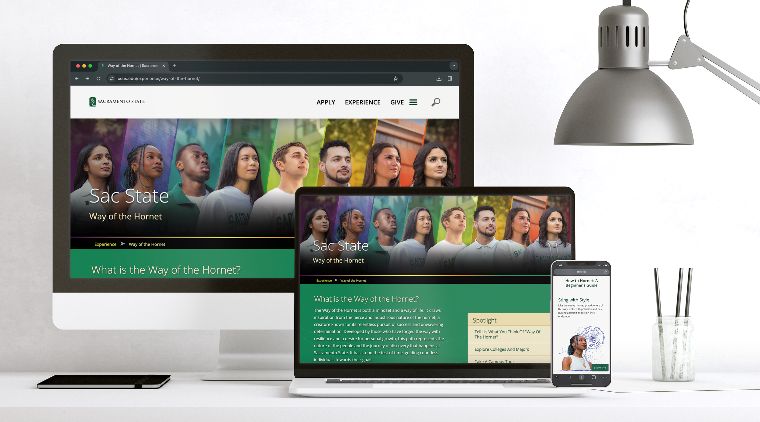 The campaign’s custom landing page serves as a central hub, offering visitors an opportunity to explore the Way of the Hornet philosophy. It integrates clear calls to action, encouraging applications, intent-to-enroll submissions, and further discovery of Sac State’s programs and culture.